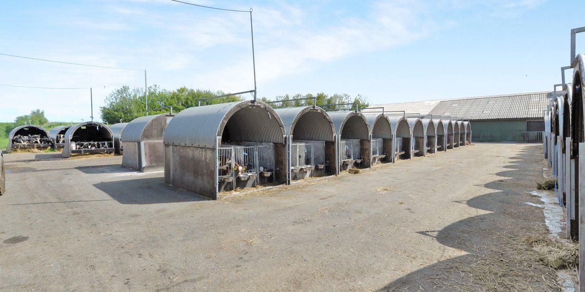 Les jeunes veaux sont en extérieur dans des cases individuelles et le reste des jeunes sont élevés dans un bâtiment séparé des vaches laitières.