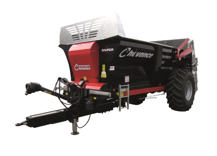 L’épandeur Chevance Sniper 12/8, surbaissé, est ultra-équipé de série : tablier accompagnateur fixé au fond mouvant, porte anti-éboulement, régulation automatisée avec système DPA... Il met en oeuvre plusieurs brevets. Le premier concerne les marteaux mobiles sur les hérissons verticaux de grand de diamètre équipés de couteaux au carbure. Avec un fumier pailleux, ces marteaux s’escamotent. En revanche, avec le compost et les produits décomposés, ils restent en place pour améliorer la qualité d’épandage. Le second brevet porte sur le système de pesée embarqué; le troisième brevet a trait au boîtier électronique de commande en cabine automatisant certaines séquences à l’utilisation. Ces caractéristiques font sans doute du Sniper le seul appareil du marché capable de traiter avec précision en dose et en répartition les composts à 2t/ha comme les fumiers pailleux à 50t/ha.