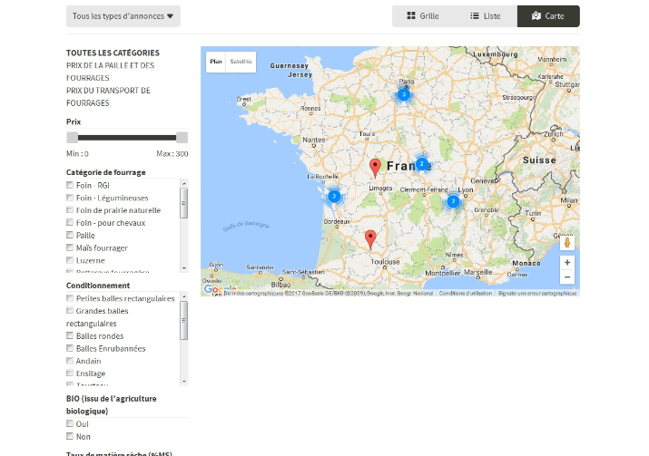 L’agriculteur souhaitant vendre sa paille peut créer son compte en quelques clicks ou directement via son profil facebook. Il peut ensuite renseigner son offre au travers de plusieurs champs spécifiques, description de l’offre, localisation géographique, niveau de stock, délais de livraison, niveau de qualité et le prix du fourrage au départ de l’exploitation. Un plus, c’est que le vendeur peut aussi publier des offres de transport exprimée en € par kilomètre. Toutes ces informations visent à faciliter l’utilisation du site par l’acheteur, avec différents filtres pour sélectionner l’offre qui lui correspond le mieux.