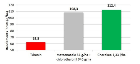 Dans ces 4 essais 2014-2016 à forte infestation rouille jaune, ce sont plus de 4 q/ha de bénéfice rendement apportés par Cherokee comparé à une autre association Triazole + chlorothalonil.