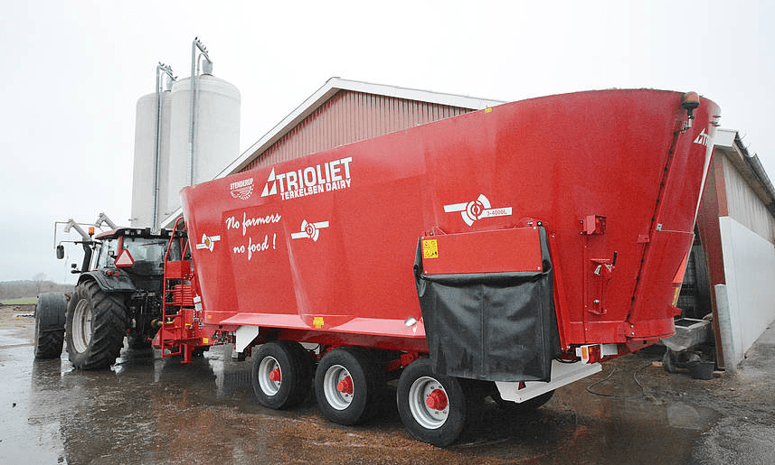 Vu que le cheptel est réparti sur trois sites différents, la nouvelle mélangeuse devait être adaptée au transport routier. Monsieur Terkelsen cherchait en outre une machine polyvalente, qui permette aussi de procéder au paillage des bâtiments abritant le jeune bétail. Il a fait part de ces souhaits à Stenderup, un importateur de la technique de fourrage Trioliet. Sur ses conseils, Henrik Terkelsen a acheté une Solomix P3 4000L ZKX-TR, une mélangeuse très résistante avec pailleuse.