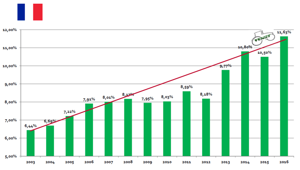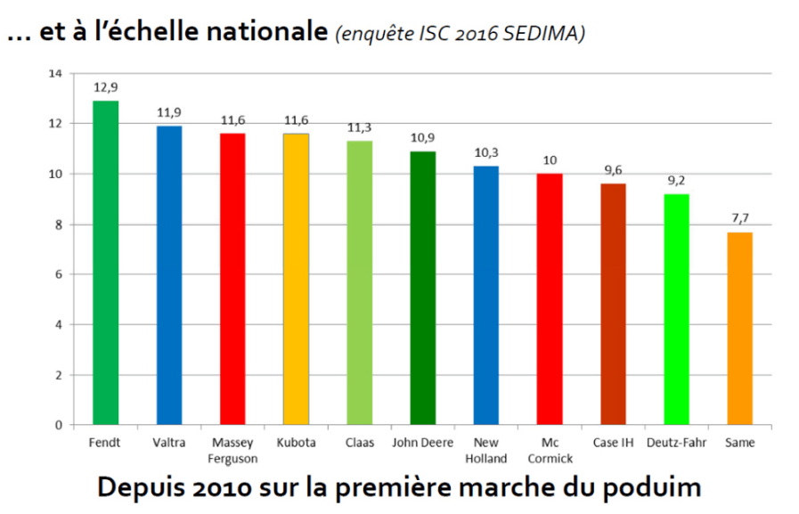Avec une croissance de plus d'un point par rapport à l'année dernière, Fendt atteint en 2016 une part de marché historique de 11,63 % sur le marché français. Fendt est aussi le premier constructeur dans le baromètre d'indice de satisfaction des concessionnaires.