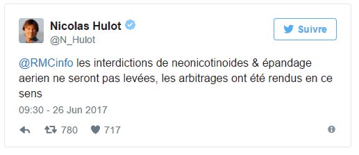 D’ailleurs dans Le monde en mars 2016, Nicolas Hulot plaidait pour une interdiction pure et simple de ces produits. "Mesdames et messieurs les parlementaires, ces produits sont toxiques. Pouvons-nous faire fi de toutes les alertes que les scientifiques mettent à notre disposition pour éclairer nos choix ? Pouvons-nous repousser indéfiniment les décisions à prendre ? En détruisant la biodiversité, notre propre sort est en jeu. Interdisons les pesticides néonicotinoïdes"