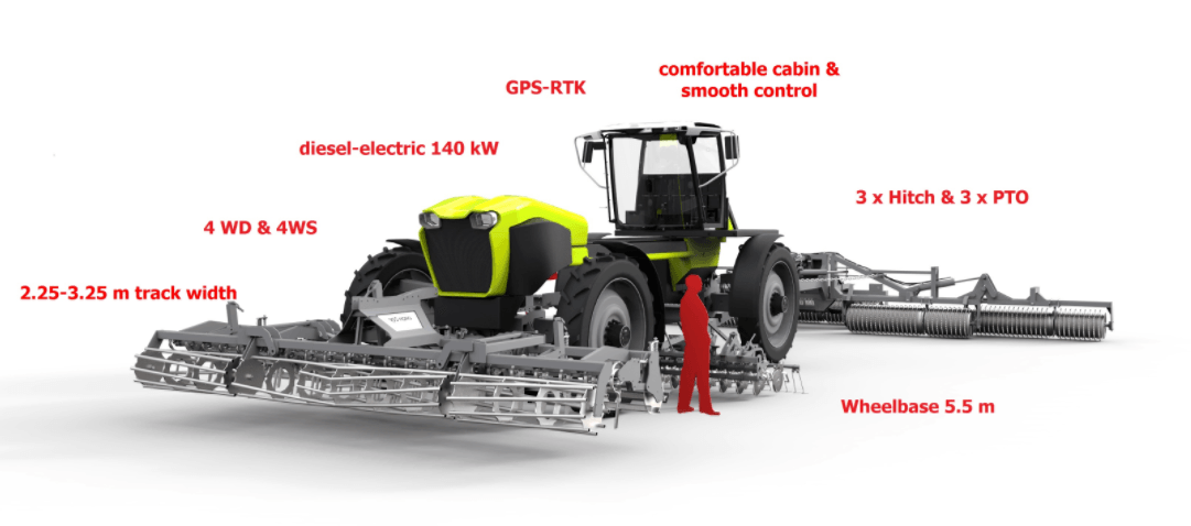 5 moteurs sur un prototype exceptionnel, un moteur 6 cylindres de 210 chevaux Steyr est couplé à 4 moteurs situés sur les roues du tracteur (44kW chacun) permet d'assurer suffisament de puissance pour tracter les 3 outils.