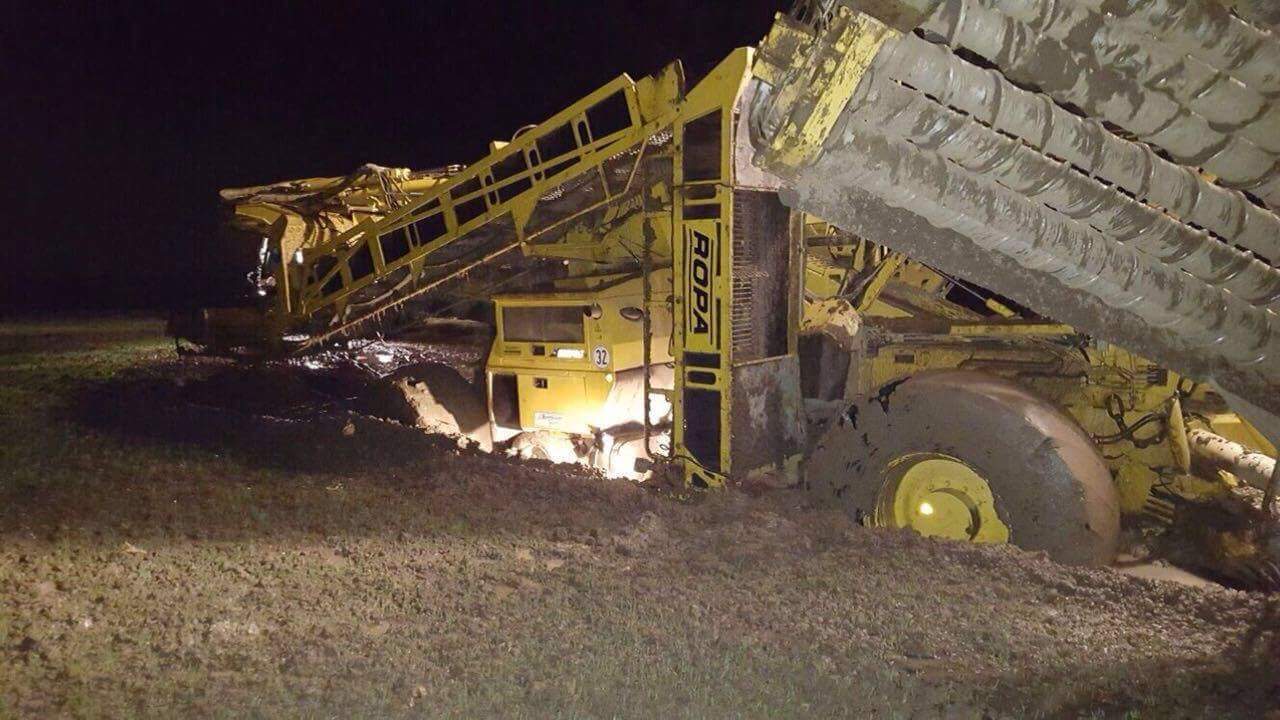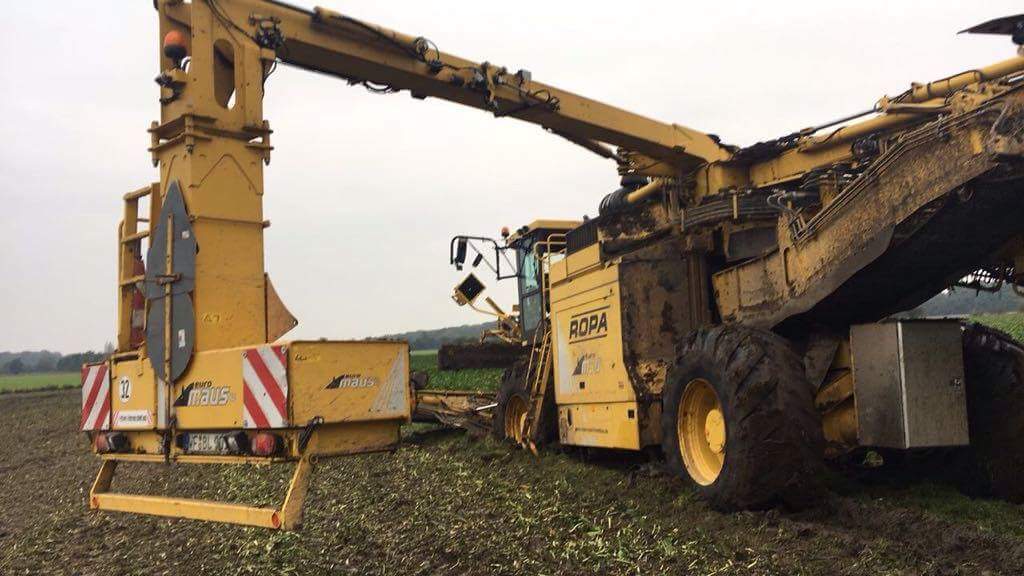 Un agriculteur allemand a diffusé les photos sur Facebook, un déterreur Ropa Maus 4 tellement enlisé qu'il a fallu une grue pour sortir la machine.