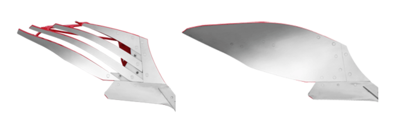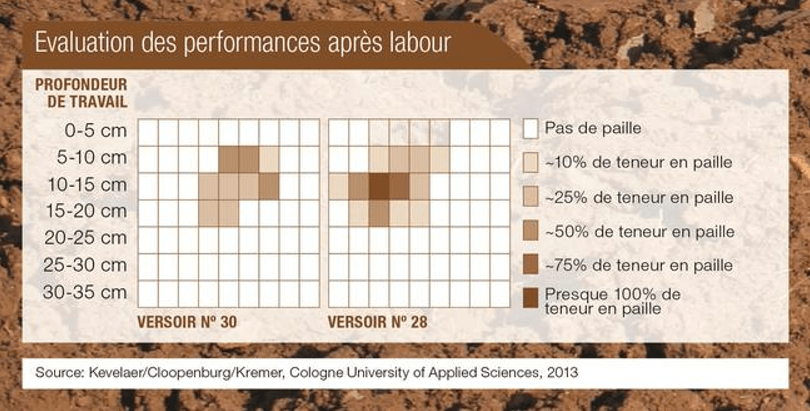 Le labour enfouit complètement les résidus végétaux et autres matières organiques. Les diagrammes ci-dessous montrent la localisation des résidus en terre après labour avec différents types de versoirs :