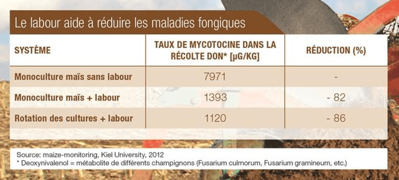 La labour réduit les maladies fongiques, selon une étude menée en 2012 par l’université de Kiel. Une rotation des cultures associée au labour donne de meilleurs résultats.