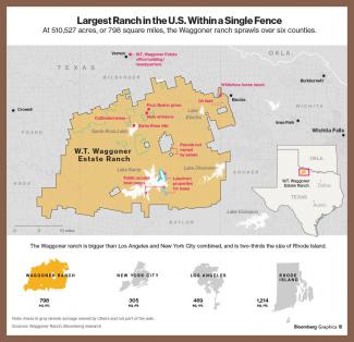 C'est le plus gros ranch d'un seul tenant aux USA. C'est aussi un monument quasiment historique, à 280 kilomètres de Dallas, qui retrace une tranche de la conquête de l'Ouest. Dan Waggoner, un petit éleveur, commence à acheter des terrains en 1849 alors que le Texas vient à peine d'être intégré dans l'Union. Au fil du temps, le ranch prospère, et les Waggoner deviennent l'une des plus grandes familles d'éleveurs du Texas, très impliquée, entre autres, dans le développement de la race bovine Hereford et de la race américaine de chevaux de course, les Quarter horses. Le président Theodore Roosevelt vient même leur rendre visite pour chasser le loup. Pendant longtemps, Tom Waggoner, le fils de Dan, se plaint de tomber sur du pétrole chaque fois qu'il fore pour trouver de l'eau. Mais le boom de l'automobile lui ouvre de nouvelles perspectives. Peu à peu, les puits envahissent la propriété. Ce qui fait dire à un humoriste célèbre : « Je vois que pour chaque vache, il y a un puits de pétrole. »