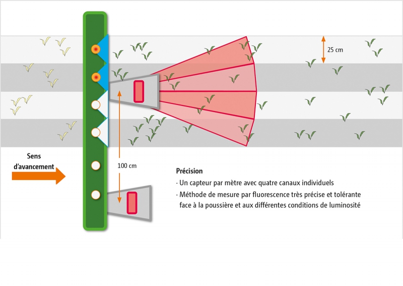 Pour détecter les plantes cibles, le pulvérisateur traîné UX AmaSpot est équipé des capteurs de fluorescence GreenSense. Ces capteurs détectent la chlorophylle et sont donc capables de distinguer les plantes vertes des sols nus. Les capteurs sont placés à 1 mètres d’intervalle sur la rampe et permet de déclencher une pulvérisation sur 25 centimètres de large.