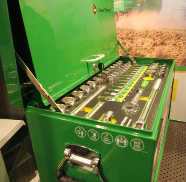 John Deere propose des servantes déjà remplis par la marque d’outils à main mais John Deere permet également la possibilité de composer son propre chariot.