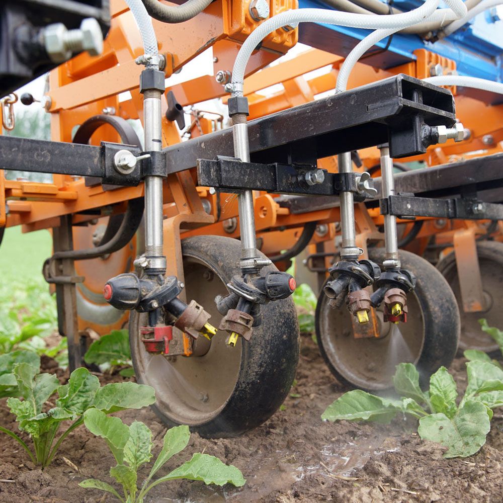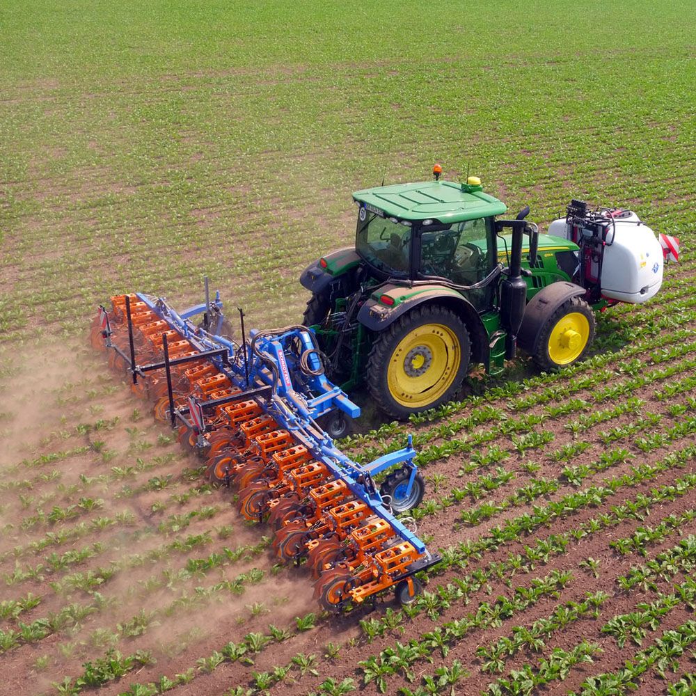 La pulvérisation et le binage peuvent être effectués en un seul passage. Dans les premiers stades, la pulvérisation applique le produit phytosanitaire sur toute la surface de la plante car les jeunes plants de maïs ou betteraves sont toujours résistants aux produits phytosanitaires.