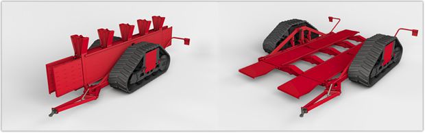 Le fonctionnement ? Un tracteur emmène le porteur Unicrawler dans le champ, et le déplie pour le mettre en place. Lorsque les ensembles tracteurs+benne arrivent au champ. Le chauffeur monte sa benne sur l’Unicrawler et solidarise le porteur Unicrawler avec la benne grâce à un crochet activé hydrauliquement. Lors de la sortie du champ, le chauffeur du tracteur désolidarise la benne du porteur Unicrawler ce qui permet au tracteur suivant d’utiliser le système.