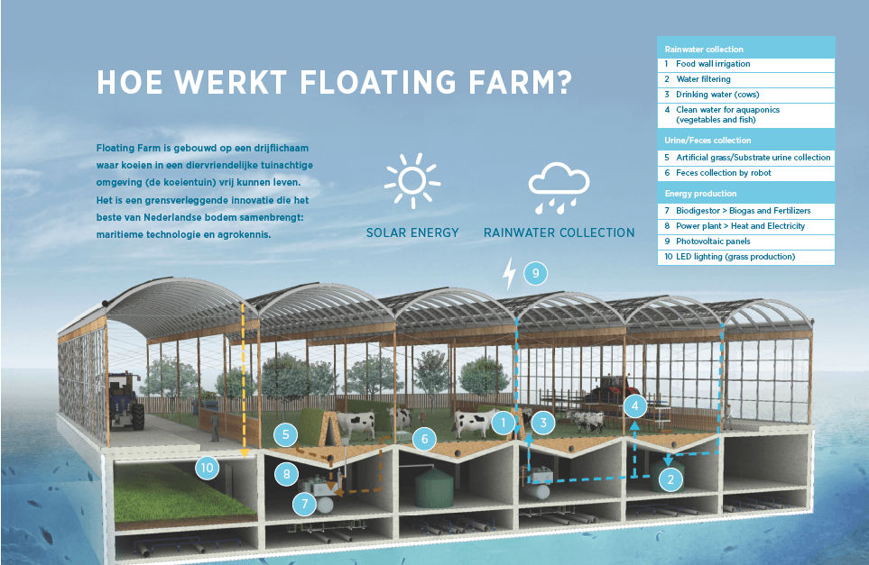 Cette ferme implantée sur une barge flottante à deux niveaux se veut écologiquement responsable. Elle produira sont énergie grâce à des panneaux photovoltaïques sur le toit de la barge. Le lisier des vaches laitière située au second étage servira d’engrais pour l’herbe du premier étage. L’herbe située au premier étage servira à son tour d’aliment pour les vaches laitières.