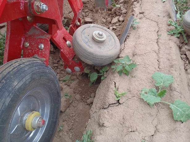 Pour permettre la lutte contre les mauvaises herbes, des éléments de coupe sont fixés au châssis du buttoir GH Eco de Grimme. Ces éléments de coupe sont guidés au moyen de roues de jauge montées sur parallélogrammes. De ce fait aussi bien le couteau gauche que le couteau droit s’adaptent indépendamment à la forme de la butte de sorte que les flancs sont toujours grattés avec précision. En coupant les mauvaises herbes, celles-ci sont détruites activement et ne peuvent pas repousser. Grâce au formeur, on obtient une butte stable et uniforme.
