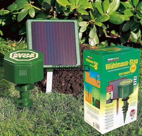 L'anti-taupes "Mole Stop Solaire" de la firme Windhager est identique au "Mole Stop 1000" sans boîtier à piles. L'alimentation est assurée jour et nuit par l'accu solaire fourni. Celui-ci est placé indépendamment afin de choisir l'endroit idéal pour une meilleure exposition à la lumière, solution écologique et économique.