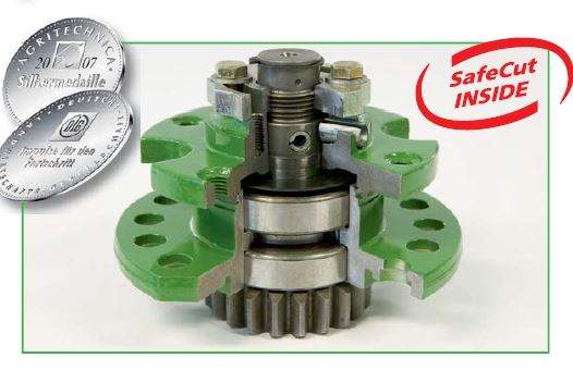 Le « SafeCut » est une sécurité anti-corps. En cas de contact avec un corps étranger, la goupille creuse formant la liaison entre le disque de coupe et l’arbre d’entraînement se cisaille. Le pignon d’entraînement continue à tourner et le disque de coupe monte vers le haut par le biais d’un filetage, il est alors en-dehors de la zone de rotation des lames voisines. Les dommages consécutifs sur les disques de coupe voisins sont donc exclus. La faucheuse est commandée au moyen du terminal « Isobus CCI » ou de la commande d’un tracteur Isobus.