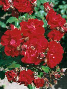 Des fleurs rouge lumineux qui restent longtemps sur les branches. Un feuillage aux jeunes pousses pourpres et une forte végétation font du rosier Vittel de la firme Kordes un excellent arbuste pour toutes les utilisations en massifs ou en haies.