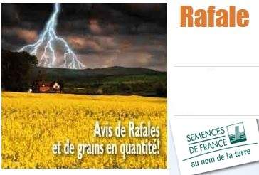« Rafale » est une variété de colza d'hiver. il s'agit d'un hybride restauré précoce et vigoureux de la firme "Semences de France". Rafale a la particularité d’avoir un cycle végétatif court de la fin floraison à la maturité ce qui lui permet d’être récolté tôt.