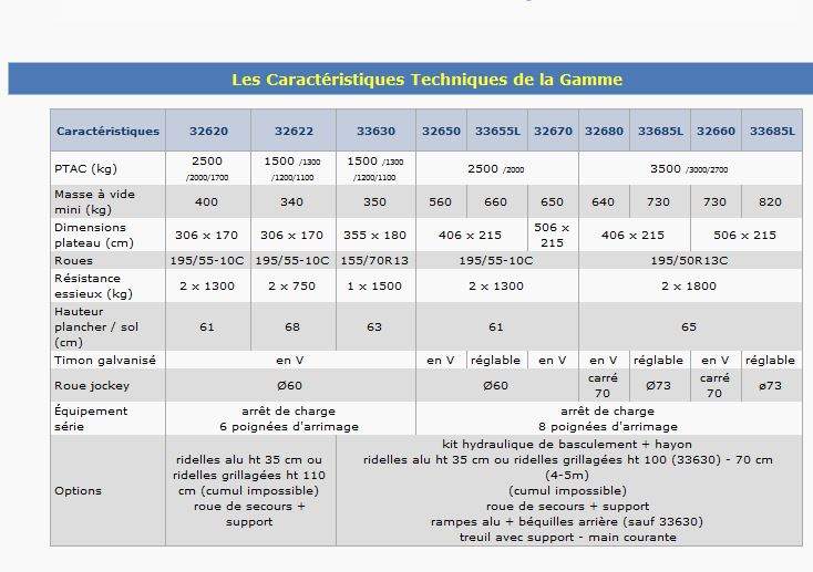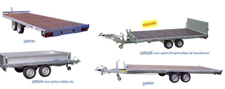 Les « plateaux roues-dessous » de la marque Lider ont un PTAC de 2500 à 3500 kg en fonction des modèles: 3620, 3622, 33630, 3265, 33655, 3267, 3268, 3266 et 33685
