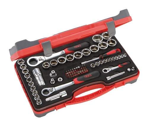 Le coffret cliquets et douilles traversantes de SAM Outillage se compose de 75 douilles et accessoires débouchés.