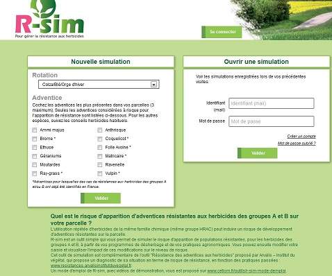 Le CETIOM, ARVALIS-Institut du végétal, l’ITB et l'ACTA proposent l'outil en ligne R-sim, qui permet d'évaluer le risque d'apparition d'adventices résistantes selon les pratiques herbicides envisagées sur la parcelle.