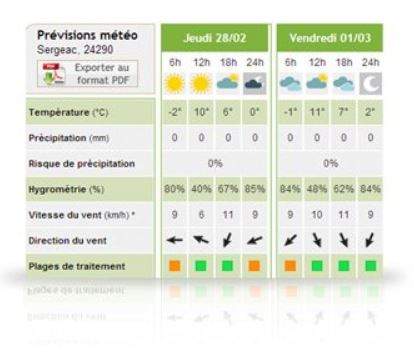Ce service s’adapte au contexte local de l’agriculteur pour devenir son outil météorologique quotidien en rentrant son code postal ou le nom de sa commune (possible jusqu’à 5 communes). Il obtient alors un bulletin professionnel à 5 jours.