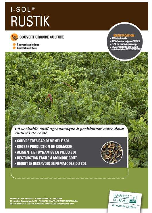 I-sol RUSTIKhttps://agriavis.com/documents/produit/optimized/10348/d73cbfc0cac42d686ef49aa9f5f942f7e7f5a4ac.jpg« I-sol RUSTIK » est composé de phacélie, d’avoine rude, de vesce de printemps et de moutarde blanche.   Très polyvalent, il convient à tous les types de sols, de rotation et de modes de semis. Il est très efficace en matière de piégeage des nitrates, de couverture de sol et de production de biomasse. Sa facilité de destruction est un atout supplémentaire pour les agriculteurs.10348