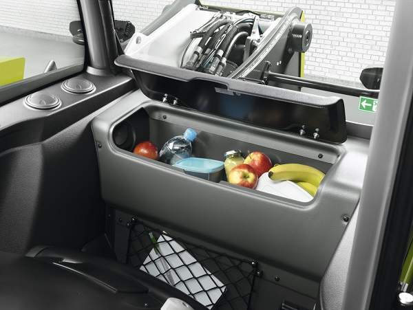 Deux grands espaces de rangement sont intégrés dans le lestage bas de la machine à l'arrière. Ils offrent un volume de rangement de 44 l et leurs capots sont verrouillables. Le travail de nuit est permis grâce au rétroéclairage des éléments du tableau de bord et aux 9 phares de travail, également disponibles en version LED en option. La grille de protection FOPS se trouve désormais à l'intérieur de la cabine.