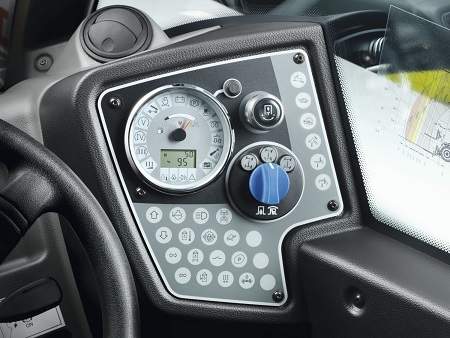 Installé sur l'accoudoir droit du siège conducteur, le monolevier offre un maximum de confort pour la commande de 13 fonctions. Par rapport aux modèles précédents, il permet également de sélectionner les trois gammes « escargot » de 0 à 7 km/h, « tortue » de 0 à 15 km/h et « lièvre » de 0 à 30 voire 40 km/h. Si le conducteur limite la vitesse maximale, il peut augmenter légèrement le régime moteur pour utiliser toute la puissance hydraulique. Le choix de la gamme influe également sur la sensibilité de la pédale d'accélérateur. Sur les nouveaux chargeurs télescopiques, les trois gammes peuvent être sélectionnées pendant l'avancement et à pleine charge en appuyant simplement sur la touche dédiée.