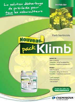 Le Pack Klimb de la firme Cheminova se compose de l'herbicide colza Naspar 500SC (métazachlore 500 g/l) et du Pertus (Colmazone 360 g/l).
