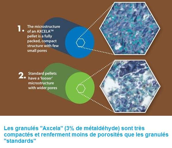 Les performances d’un molluscicide sont étroitement dépendantes de la qualité de l’appât. La structure d’Axcela est source de propriétés au champ uniques. Sa matrice gélifiée compacte est plus stable et est dotée d’une excellente tenue. Sa formule, sans polymère chimique le rend naturellement plus appétent. Après épandage, on observe une expansion importante des appâts d’Axcela. La texture gélatineuse qui en découle facilite sa consommation.