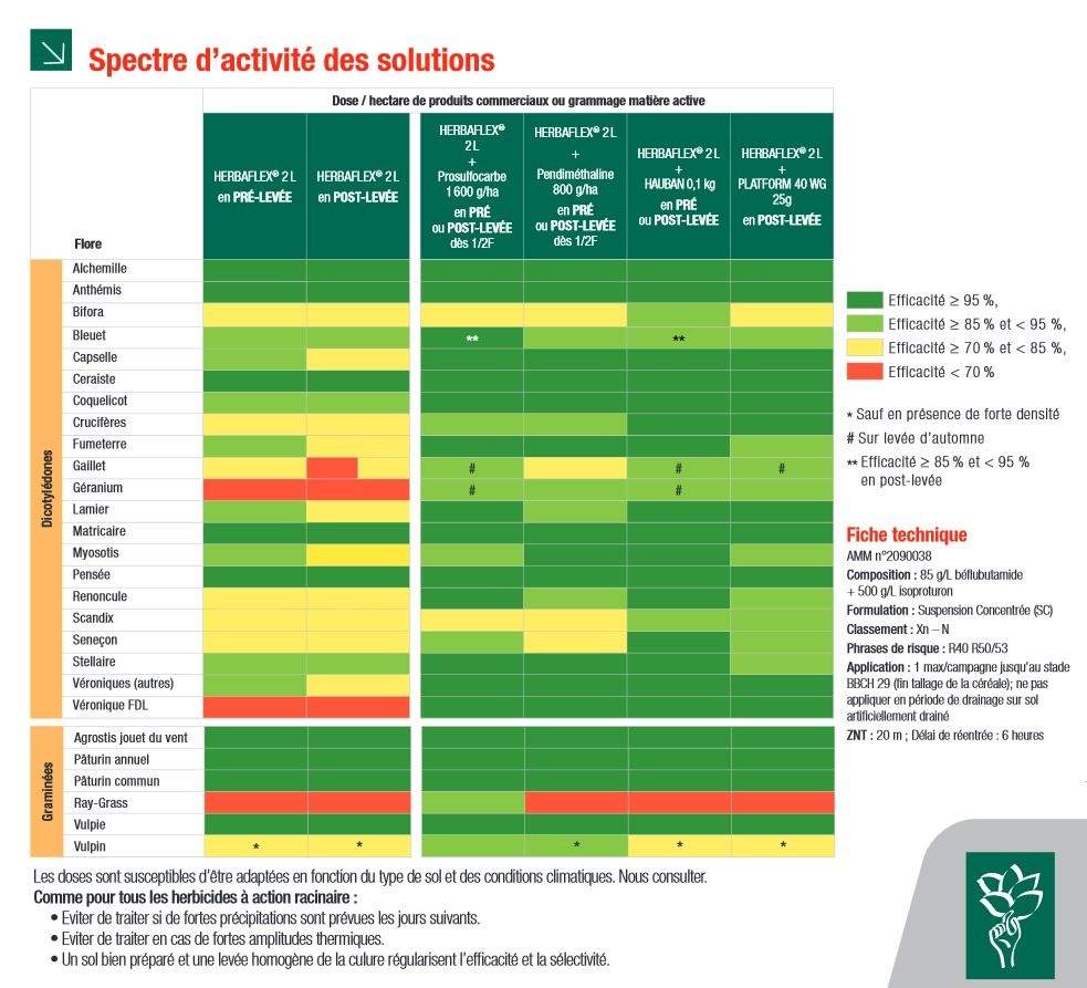 L'herbicide Herbaflex de la firme DeSangosse se compose de 85 g/L de béflubutamide + 500 g/L d'isoproturon.