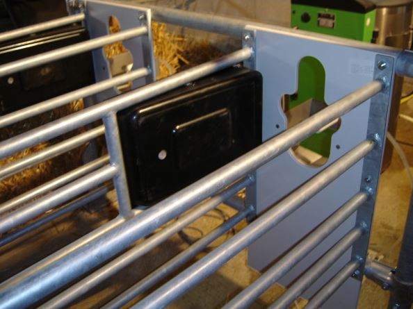 Les veaux ont accès à la tétine dans des stations étroites en acier inoxydable, équipées d'un capteur de reconnaissance. Chaque veau porte un collier d'identification électronique à la norme ISO FDX-B. Il permet de commander une quantité rationnée ou seulement contrôlée en fonction du stade de croissance de l'animal.
