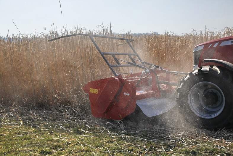 Le broyeur Kuhn « WS 320 BIO » broie et andaine en un seul passage. Ce broyeur frontal est destiné à la récolte de plantes énergétiques à fort volume de végétation tel que le miscanthus, l’arundo donax,....