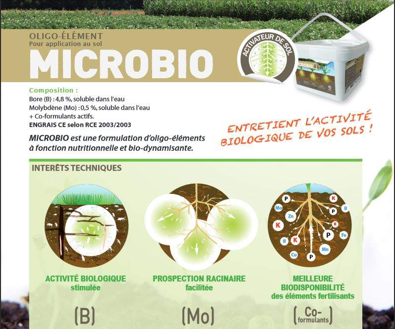 Engrais CE (selon RCE 2003/2003), MICROBIO est une formulation d’oligo-éléments à fonction nutritionnelle et bio-dynamisante.