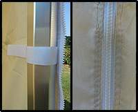 Les murs de côté sont reliés entre eux par des fermetures éclair et avec la bâche par une bande velcro. Les murs de côté sont reliés à la structure par des bandes velcro.