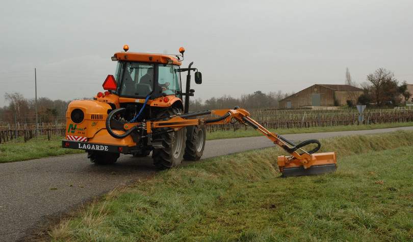 NEPTUNE - 65/80 CV - 5m, bras déporté La Neptune est une débroussailleuse à bras de déport de 5,00 m de portée horizontale. Elle reçoit un entraînement hydraulique du rotor de type centre fermé (pompe et moteur à piston) développant 65 cv et une commande de type monolevier basse pression. Comme l'ensemble des débroussailleuses de la marque, la Mercure dispose du standard de qualité Lagarde. La Neptune+ est une version plus puissante; elle reçoit toujours un circuit hydraulique à centre fermé mais offre une puissance de 80 cv au rotor. Parfaitement adaptée au gros débroussaillage, cette version peut également recevoir un rotor type gros bois. La suspension oléopneumatique apporte une souplesse dans la manipulation et assure un suivi lors de hauteurs de terrain différentes. Une sécurité placée sur le bras de déport permet un effacement du groupe de broyage lors d'effort trop important et diminue ainsi l'ensemble des contraintes sur les éléments mécaniques. Un système "Float" mis en œuvre depuis le poste de conduite assure un suivi de terrain.. Avancé de 1,30 m grâce au bras de déport, le groupe de broyage se trouve sous l'oeil du conducteur. La visibilité exceptionnelle que procure ce bras de déport est un avantage certain en terme de confort de conduite, de qualité de travail et de vitesse de chantier; un coup d'œil suffit pour à la fois contrôler le travail, anticiper les manipulations et manipuler la commande. Le nouveau groupe de broyage 1,20m qui équipe les débroussailleuses Neptune dispose du double sens de rotation inversable du poste de conduite. Il permet donc de travailler à "rebrousse-poil" pour le fauchage d'herbe mais aussi "en tombant sur la végétation" pour le débroussaillage. La transmission indirecte (poulie/courroie) réduit l'encombrement du groupe de broyage facilitant ainsi l'accessibilité en fond de fossés, diminue les coups de bélier sur le moteur hydraulique augmentant sa durée de vie et protège le moteur de tout corps étranger pouvant l'endommager. Le rotor herbe monté de série sur ces débroussailleuses reçoit un nombre de lames Y important (60 lames). Il assure un travail de fauchage, de débroussaillage de très haute qualité. Un rotor renforcé, spécial débroussaillage peut équiper ces débroussailleuses. Il reçoit au choix des lames Y ou des marteaux et offre une possibilité de débroussaillage de branche jusqu'à 6 cm de diamètre. Le rouleau palpeur de grand diamètre (140mm), facilite le roulement du groupe de broyage et diminue les contraintes sur l'ensemble des éléments mécaniques. Les embouts démontables du rouleau palpeur renferment des roulements de grande dimension et les protègent ainsi d'enroulement intempestif. > Une conception de bras et d'articulation de type TP; toutes les articulations sont montées sur bagues alvéolées, les points d'encrage des vérins sont de dimension importante. > Un aéroréfrigérant assure le maintien de l'huile à une température raisonnable. > Au transport, aucun effort n'est appliqué au vérin, la machine est entièrement tenue mécaniquement; plus de sécurité > Deux types d'attelage sont disponibles sur ces débroussailleuses. Le premier système est un attelage semi automatique comportant deux haubans de stabilisation. Le second est un attelage par châssis articulé ; il augmente l'assise de la débroussailleuse sur le tracteur et rend la combinaison plus stable. > Un pare-chocs renforcé intègre la signalisation routière. |