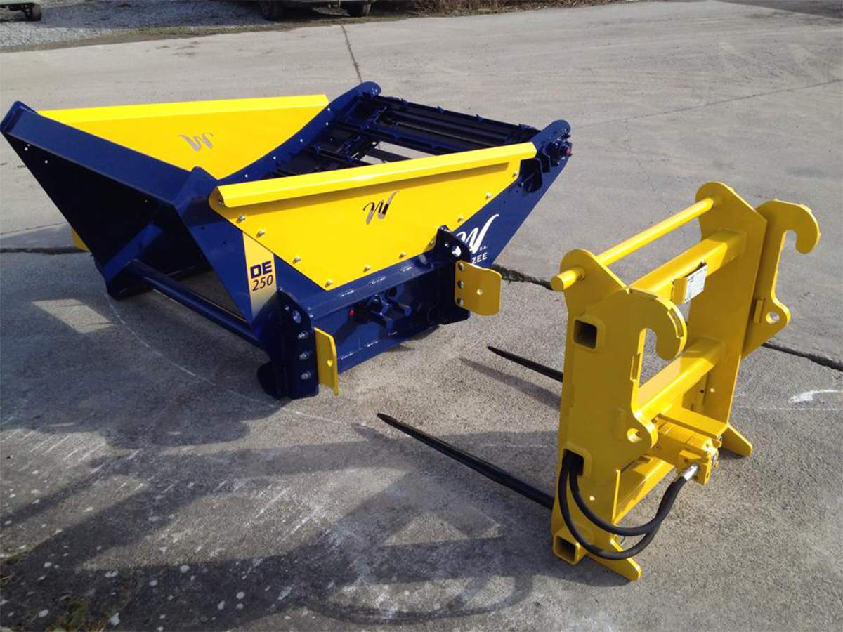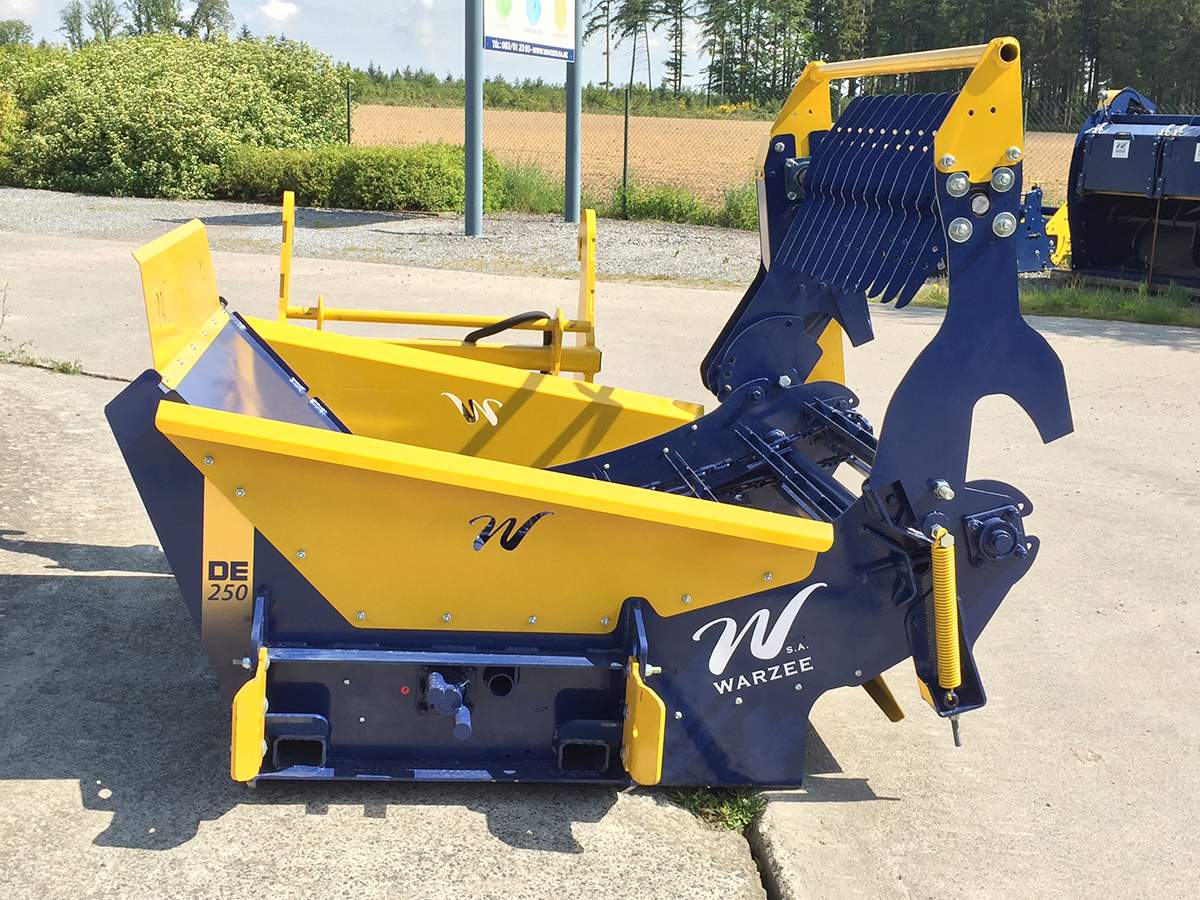 Plus compacte que la DE450, cette dérouleuse possède néanmoins le même type d'accrochage automatique propre aux machines Warzée. Grâce à un tablier pique-bottes muni d'un crabot, l'attelage entre le tablier et la dérouleuse se fait automatiquement, sans même devoir descendre du chargeur. Aucune connexion n'est nécessaire.