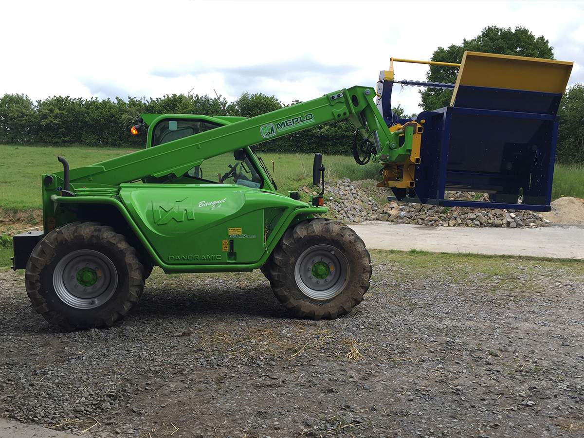 Cette dérouleuse est munie du système d'accrochage automatique propre aux machines Warzée. Grâce à un tablier pique-bottes muni d'un crabot, l'attelage entre le tablier et la dérouleuse se fait automatiquement, sans même devoir descendre du chargeur. Aucune connexion n'est nécessaire.