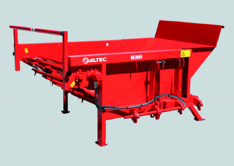 DR200 Shttps://agriavis.com/documents/produit/optimized/12548/47020dee8683d06b4a4e28c3c44071b9b6a2c076.png Dérouleuse pour balles rondes Ø 90 à 200 cm fixe Attelage 3 points 2 positions de série : centrée ou déporté de 30 cm. distribution à droite ou à gauche en option. Le bras de chargement peut être facilement ajouté. Trémie fermée : la balle ne s'échappe pas Possibilité d'attelage sur chargeur ou télescopique     Dérouleuse à fond mobile de conception exclusive ALTEC, pour distribuer en douceur, paille, foin, enrubanné. "Bien dérouler la balles jusqu'au bout" Résistante : Conçue pour toutes les balles, tous diamètres jusqu'à 1000 Kg. Châssis et trémie robustes. Sobre : Fonctionne avec tous les tracteurs, même petits et à bas régimes, sans utiliser la prise de force. Peu d'usure : Une fabrication soignée avec des matériaux de première qualité. Chaînes et galets résistants jusqu'à 4 tonnes, barrettes profilées en U etc... Autres caractéristiques Type de balles : Rondes Ø 90 à 200 cm Hydraulique : 1 Double Effet Bras de chargement : Non Rotation : Sans 12548