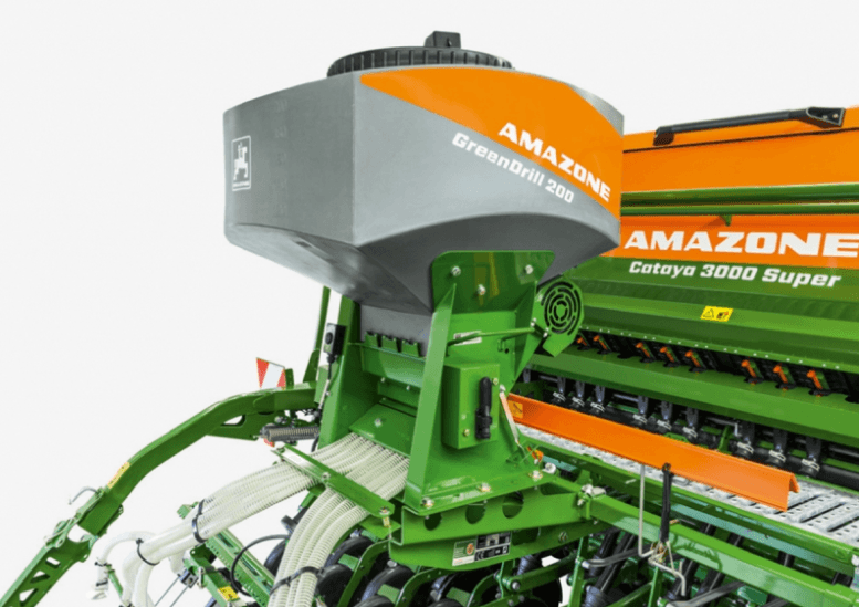 La trémie du GreenDrill contient 200 l ou 500 l, un marchepied facilite son accès. En fonction des débits et de la semence utilisée, 2 bobines de distribution sont proposées, l’une avec des dentelures fines et l’autre avec des ergots plus profonds. L’entraînement de l’arbre de distribution est électrique et celui de la turbine électrique ou hydraulique.