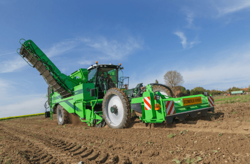 - Prise maximale : La largeur des conduits de récolte est de 1 450 mm (4 x 75) ou de 1 550 mm (4 x 90). Les diabolos en plastique traînés, les disques de coupe traînés et les larges rouleaux tire-fanes garantit une prise sans faille et extrêmement fiable des pommes de terre.