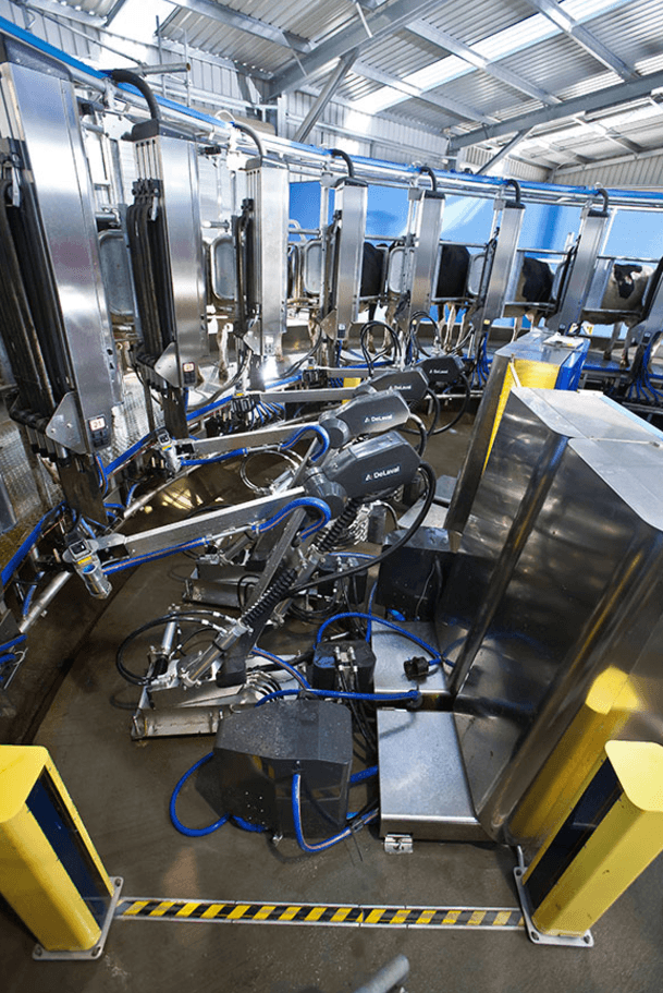 La plate-forme en épi robuste de 24 places mesure 13 mètres de diamètre. Les pompes à vide aux performances élevées, alimentées par le variateur de vitesse le plus récent, assurent un vide stable pendant toute la durée de la traite, tout en maintenant les niveaux de bruit, les interférences magnétiques et les coûts au plus bas niveau. Le raccord tournant au centre au roto transporte le lait, les données traite, l'eau de lavage, l'air et l'électricité, vers et depuis l'AMR™ DeLaval.