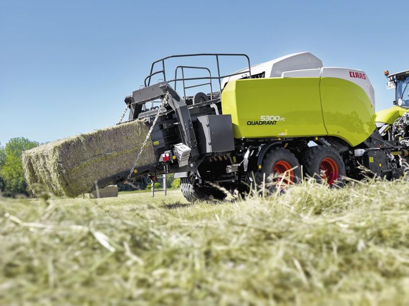 La presse à balles cubiques Claas QUADRANT 5300 FC permet de confectionner des balles carrées d'une taille de 120*90*300, avec un pick-up de 2.35 m de large. L'option Fine Cut permet de couper le fourrage grâce à 51 couteaux.