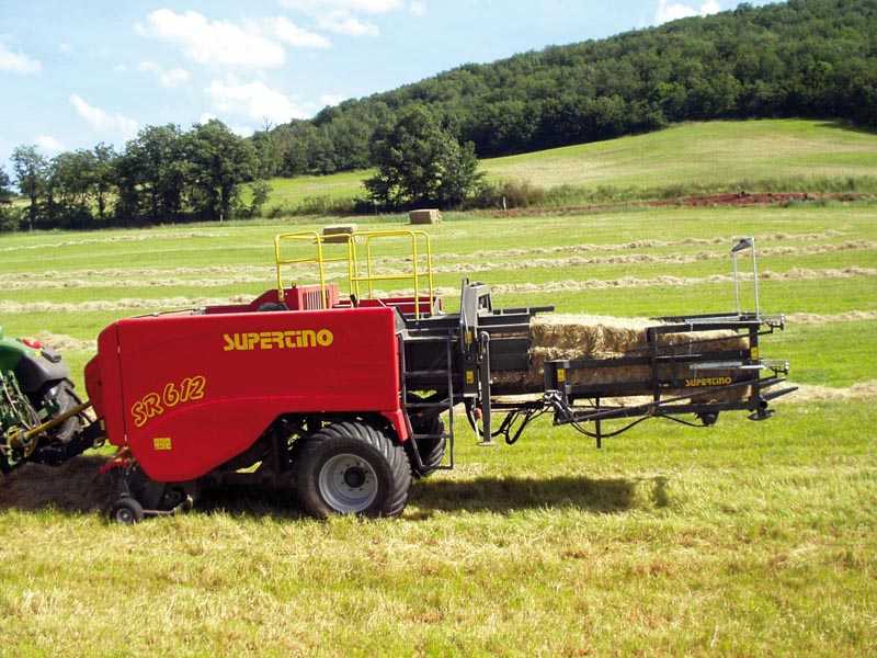La presse à balles cubiques SUPERTINO SR 612 permet de confectionner des balles carrées d'une taille de 120*58*250, avec un pick-up de 2.20 m de large.