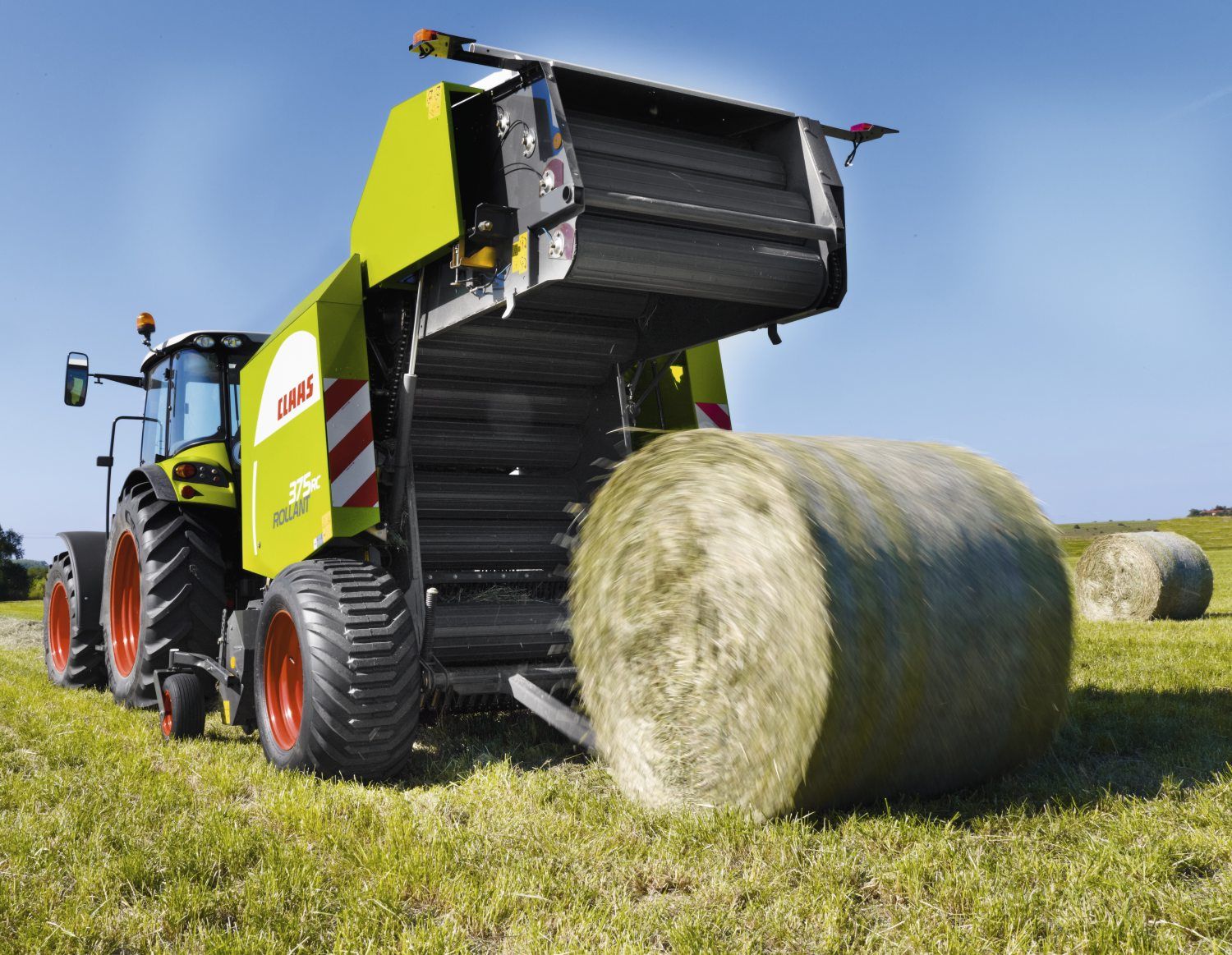 La presse à balles rondes Claas Rollant 374 RF permet de confectionner des balles rondes d'une largeur de 1.20 m et d’un diamètre de 1.20 m, avec un pick-up de 1.90 m de large. L'option Rotocut permet de couper le fourrage grâce à 7 couteaux.