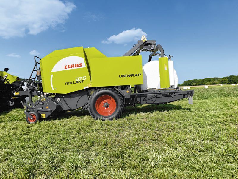 La presse à balles rondes Claas Rollant 375 RC UNIWRAP permet de confectionner des balles rondes d'une largeur de 1.20 m et d’un diamètre de 1.25 m, avec un pick-up de 1.90 m de large. L'option Rotocut permet de couper le fourrage grâce à 16 couteaux.