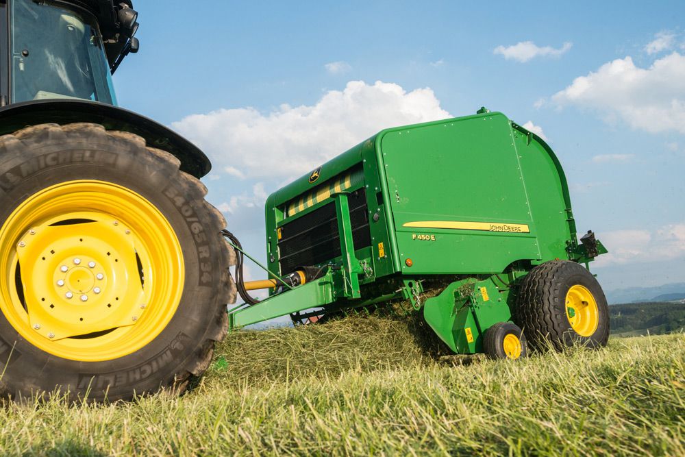La presse à balles rondes John Deere F450E permet de confectionner des balles rondes d'une largeur de 1.20 m et d’un diamètre de 1.50 m, avec un pick-up de 1.79 m de large.