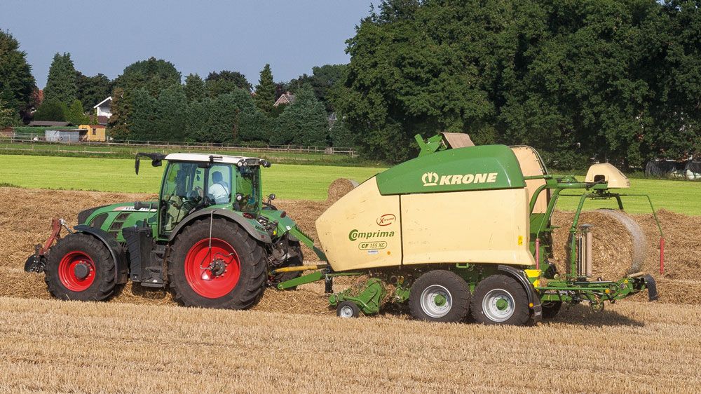 Le combiné presse + enrubanneuse à balles rondes Krone Comprima CF 155 XC X-treme permet de confectionner des balles rondes enrubannées d'une largeur de 1.20 m et d’un diamètre allant de 1.25 m à 1.50 m, avec un pick-up de 2.15 m de large. L'option XCut permet de couper le fourrage grâce à 17 ou 26 couteaux.