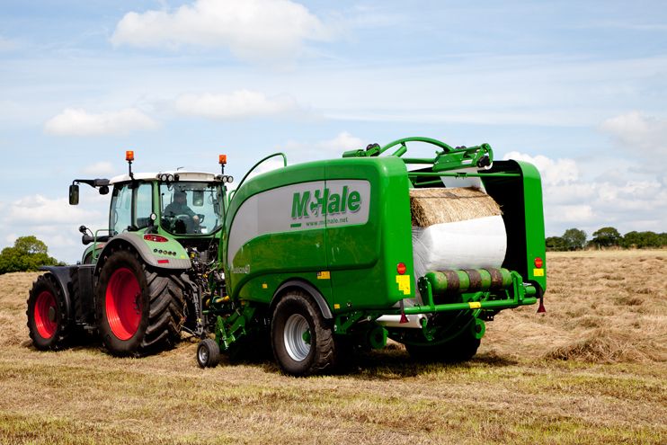 Le combiné presse + enrubanneuse à balles rondes Mc Hale Fusion 3 Presse-Enrubanneuse permet de confectionner des balles rondes enrubannées d'une largeur de 1.23 m et d’un diamètre de 1.25 m, avec un pick-up de 2.10 m de large. L'option de l'unité de coupe permet de couper le fourrage grâce à 25 couteaux.